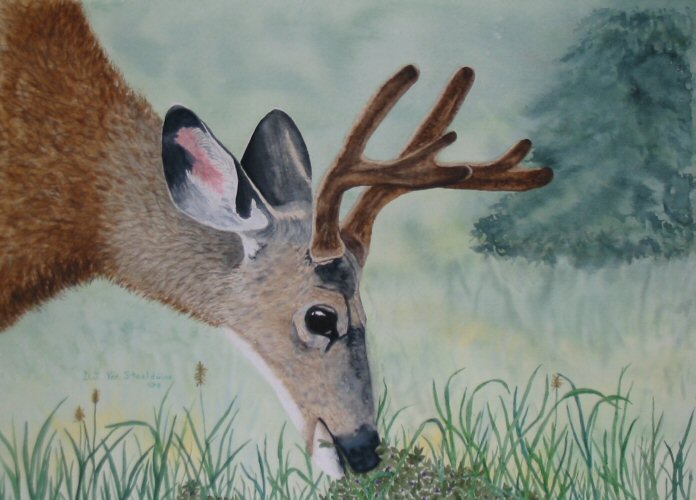 This young whitetail buck was seen just outside Maligne Lake in Jasper National Park grazing next to the road. He was unfazed by the traffic and quite focused on the new grass shoots.